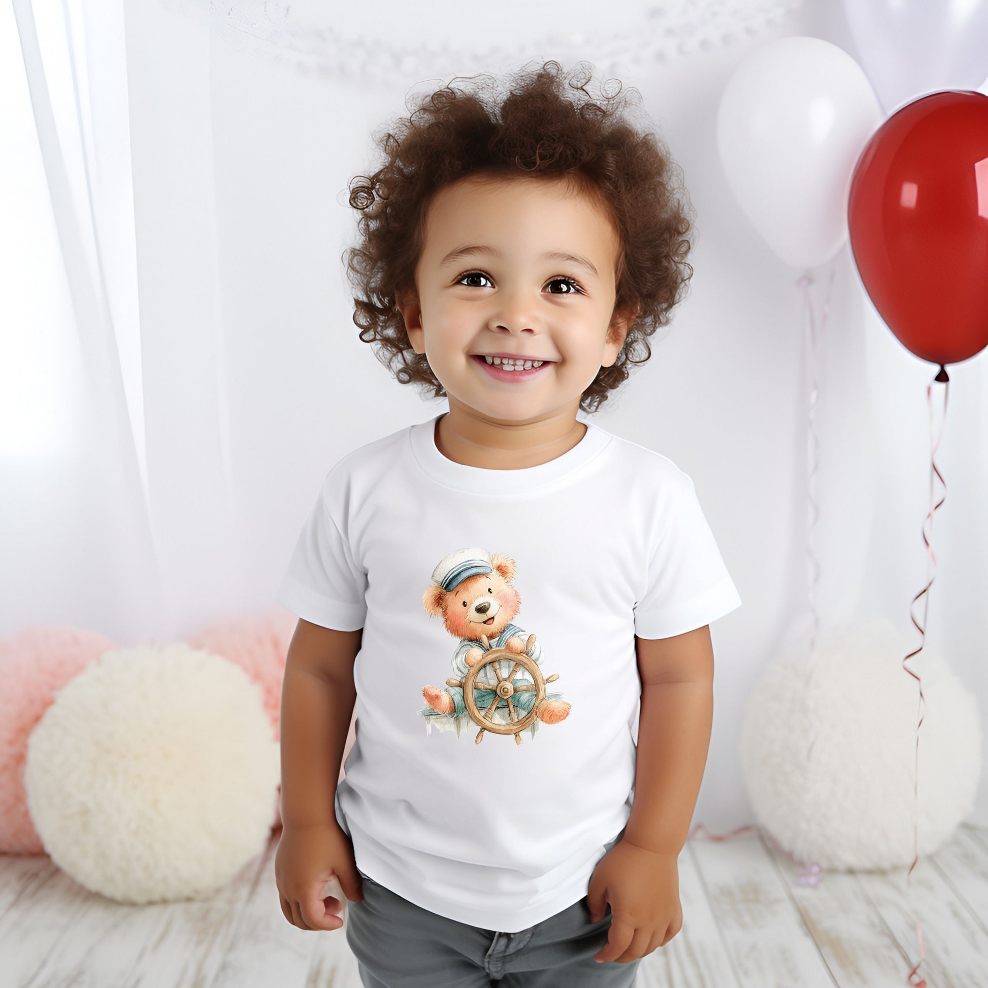 This adorable toddler t-shirt features a sweet bear illustration inspired by classic childhood adventures — sailing the seas and soaring the skies. Designed with soft watercolor tones and a gentle, storybook feel, it’s perfect for curious little explorers.
