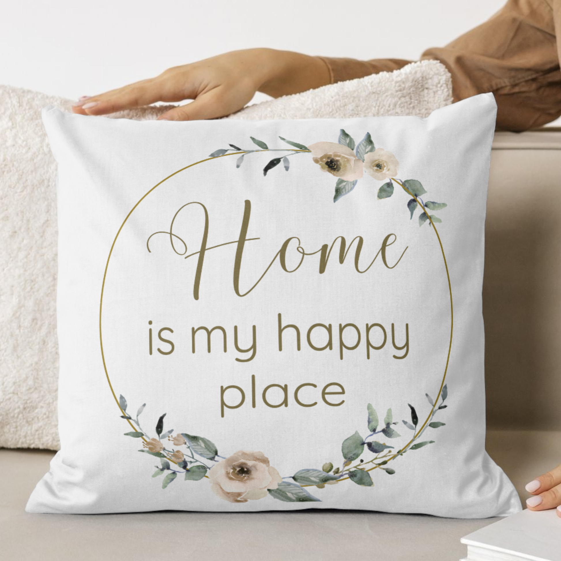 Create a calm, welcoming atmosphere with this “Home Is My Happy Place” throw pillow, designed to bring warmth and comfort into any space.