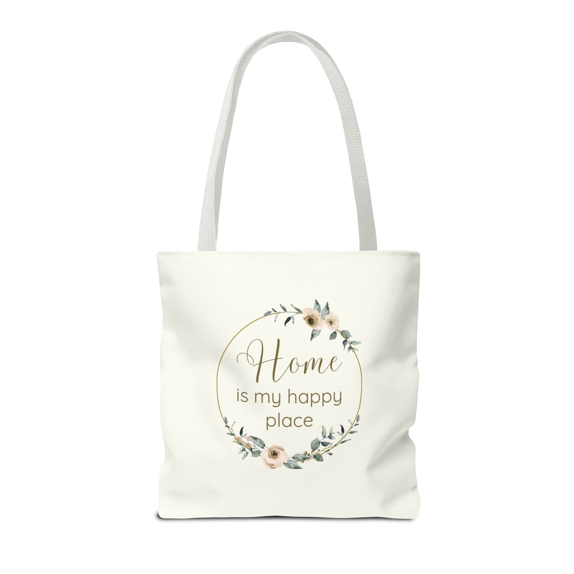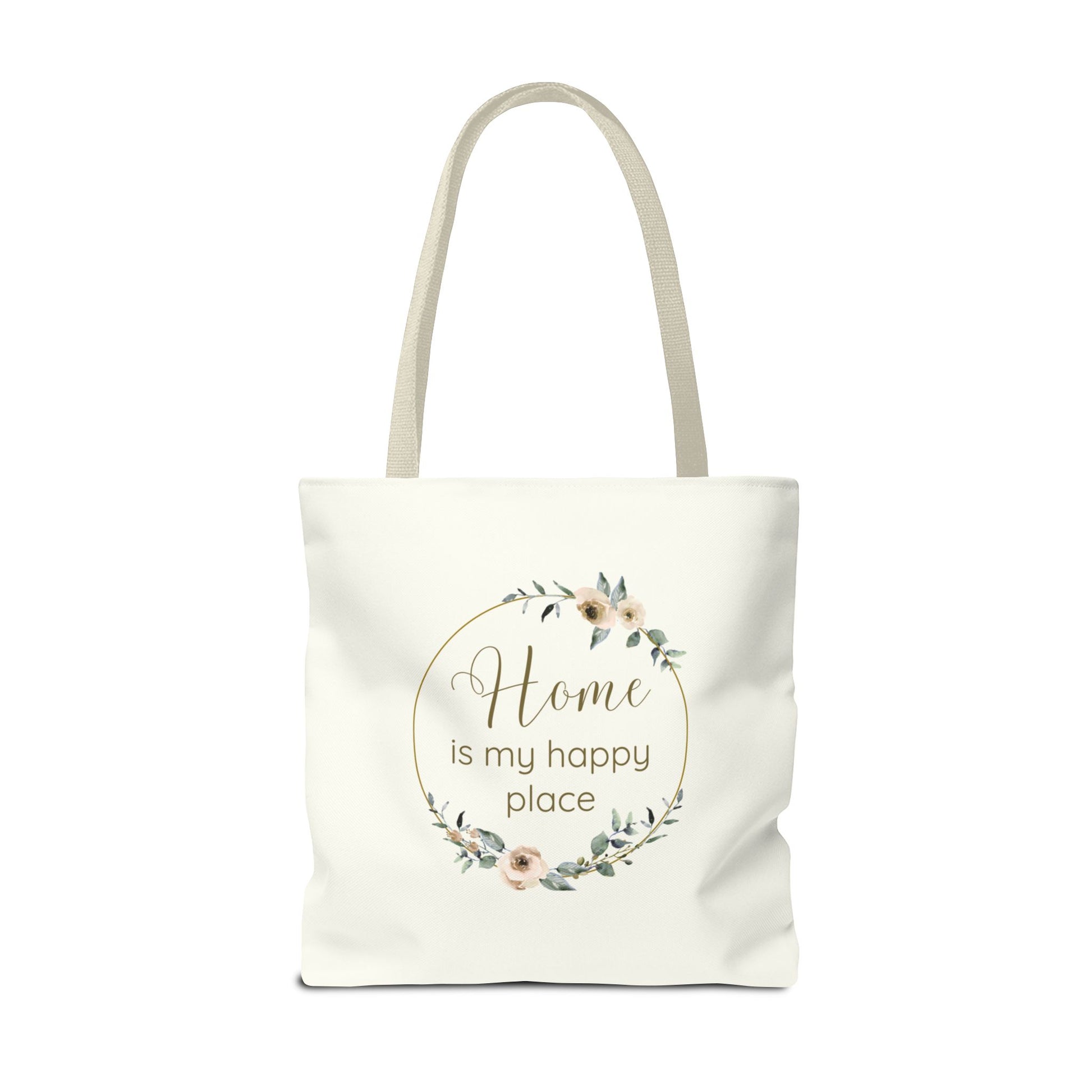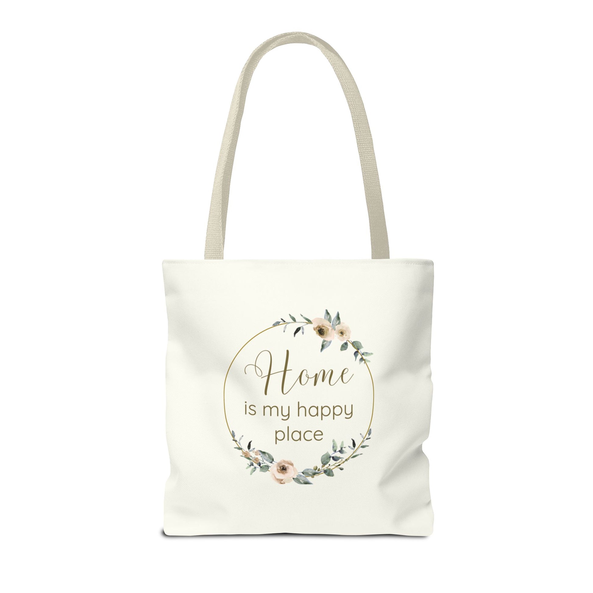 Carry a little comfort with you wherever you go with this “Home Is My Happy Place” canvas tote bag.