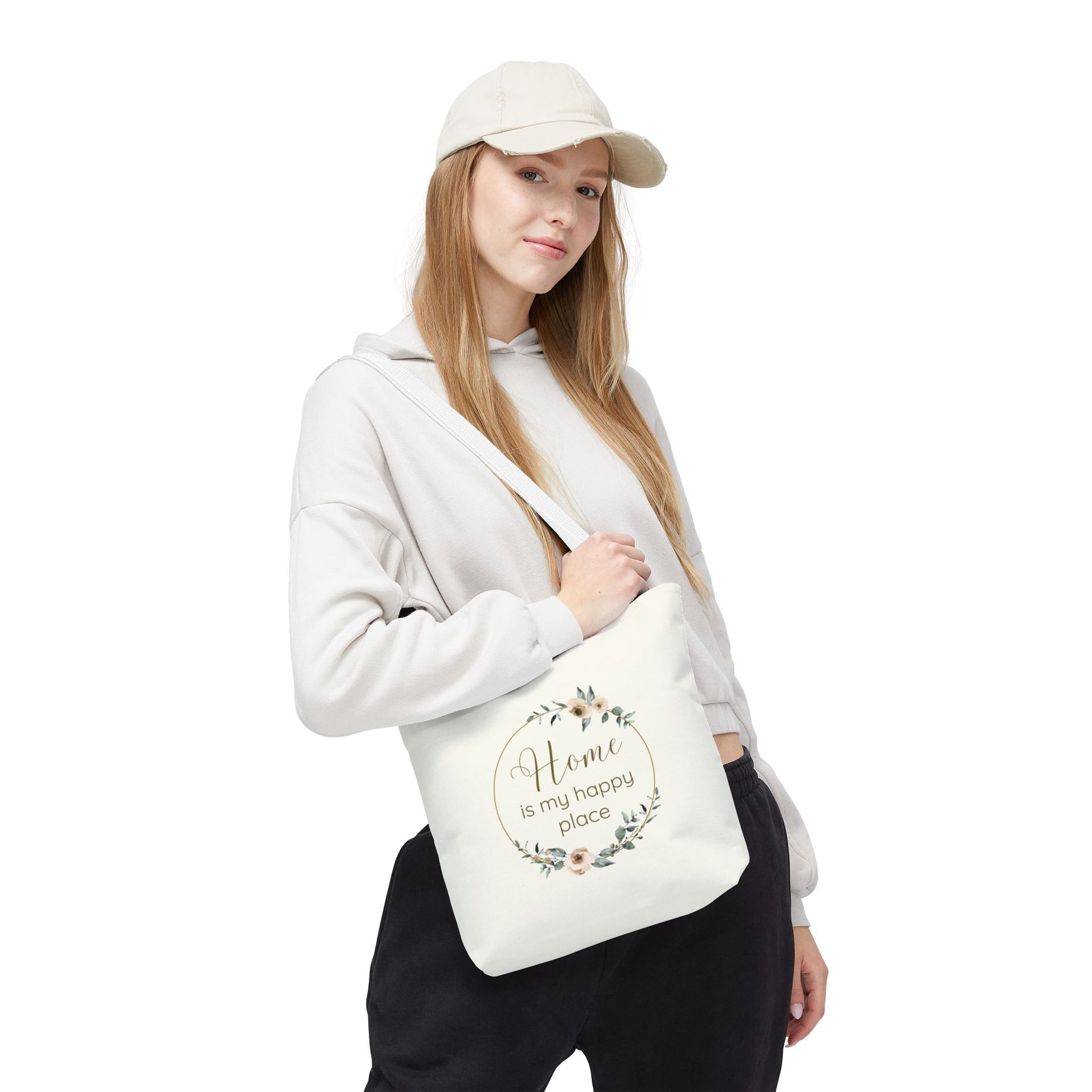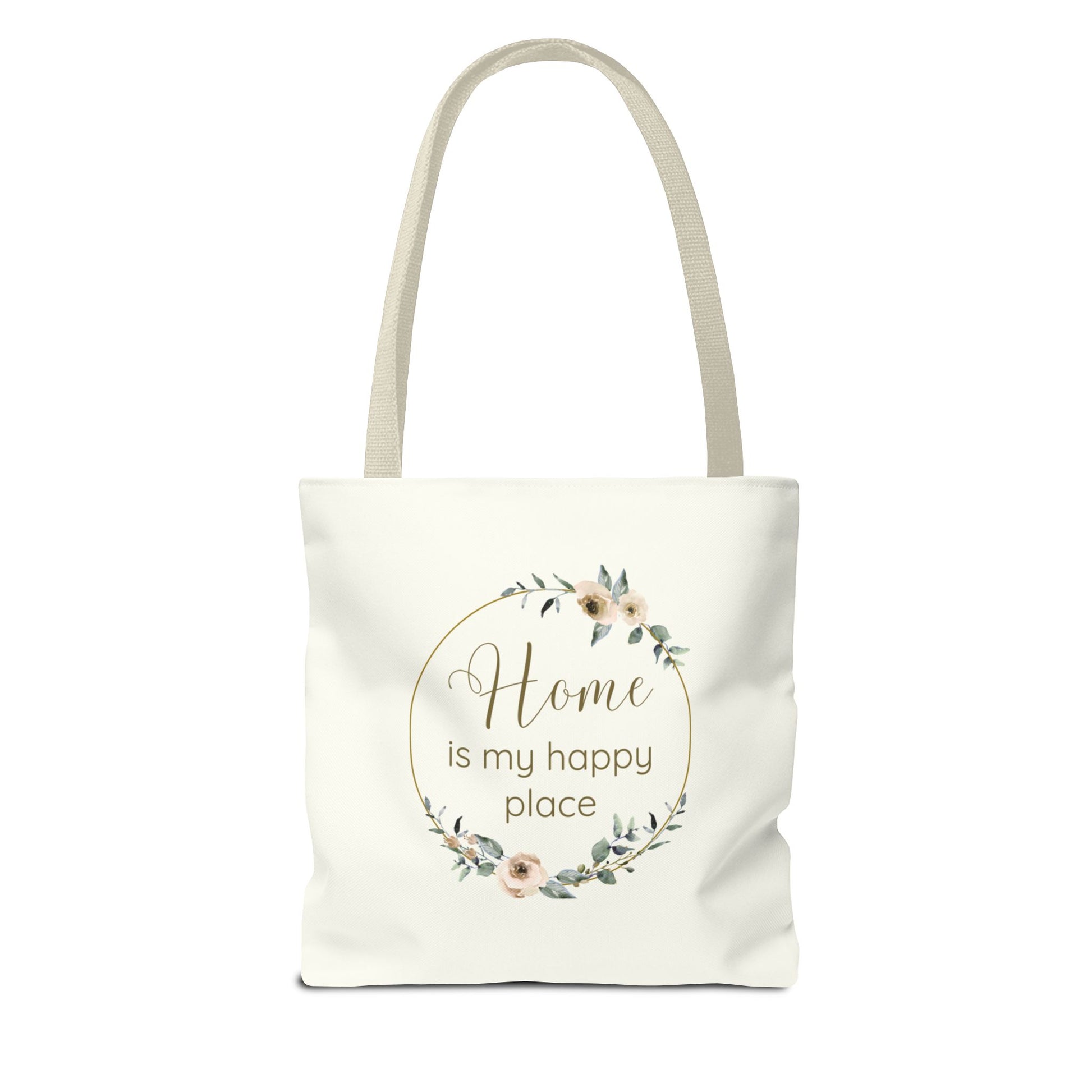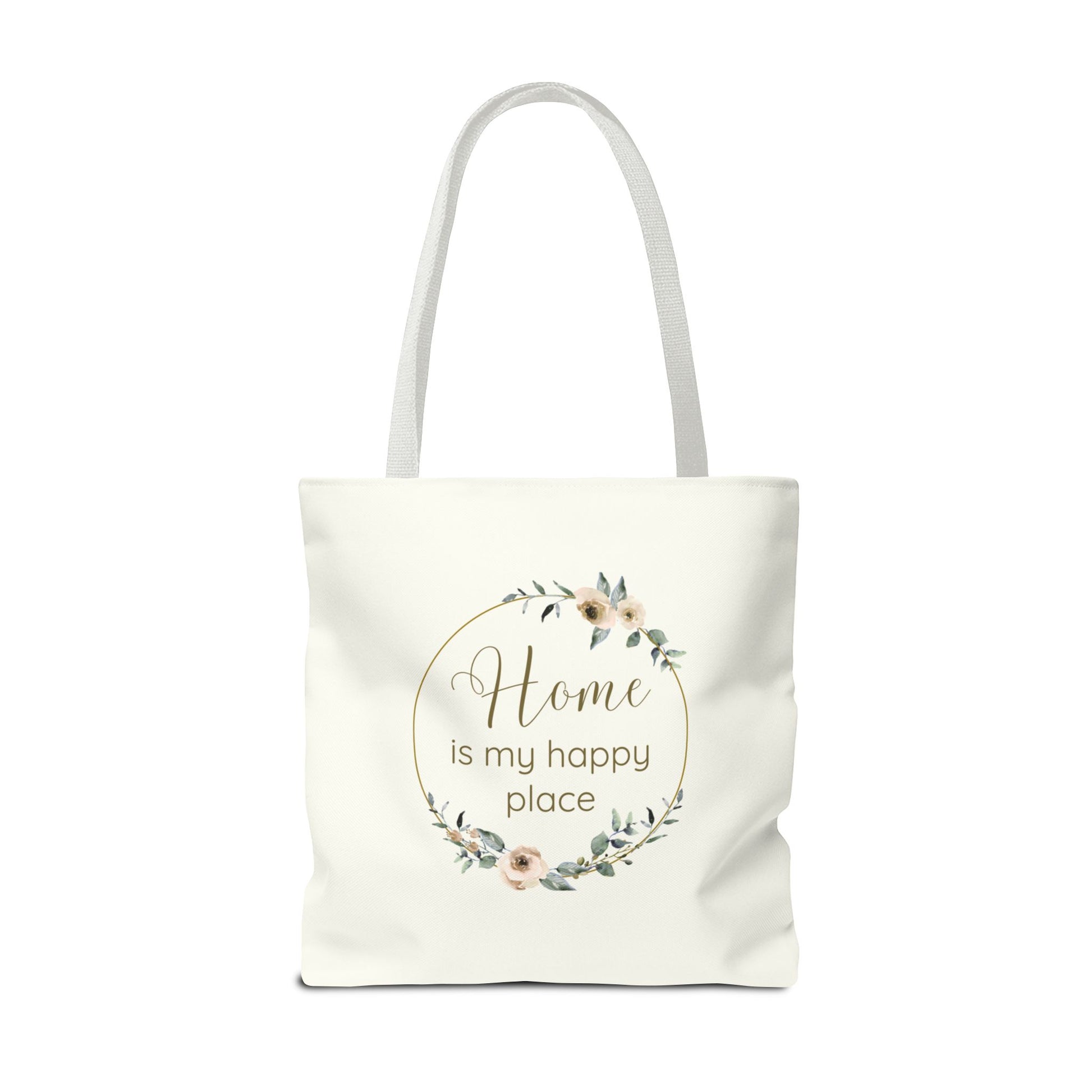 Carry a little comfort with you wherever you go with this “Home Is My Happy Place” canvas tote bag.