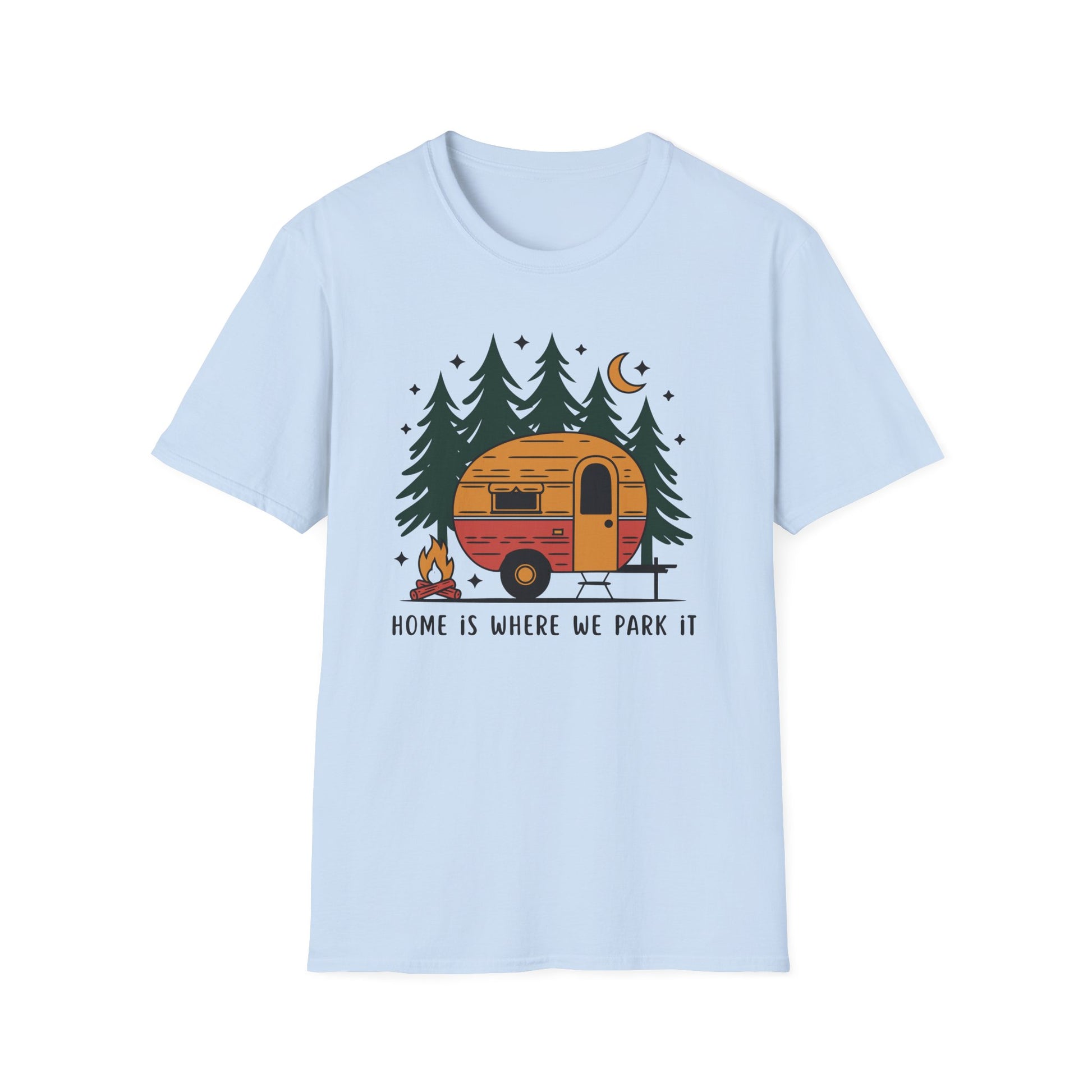 This Home Is Where We Park It t-shirt features a warm, nostalgic camper illustration that captures the freedom of travel, road trips, and life on the move. A thoughtful gift for road trip lovers, campers, van life fans, and anyone who believes home is wherever the journey takes them.