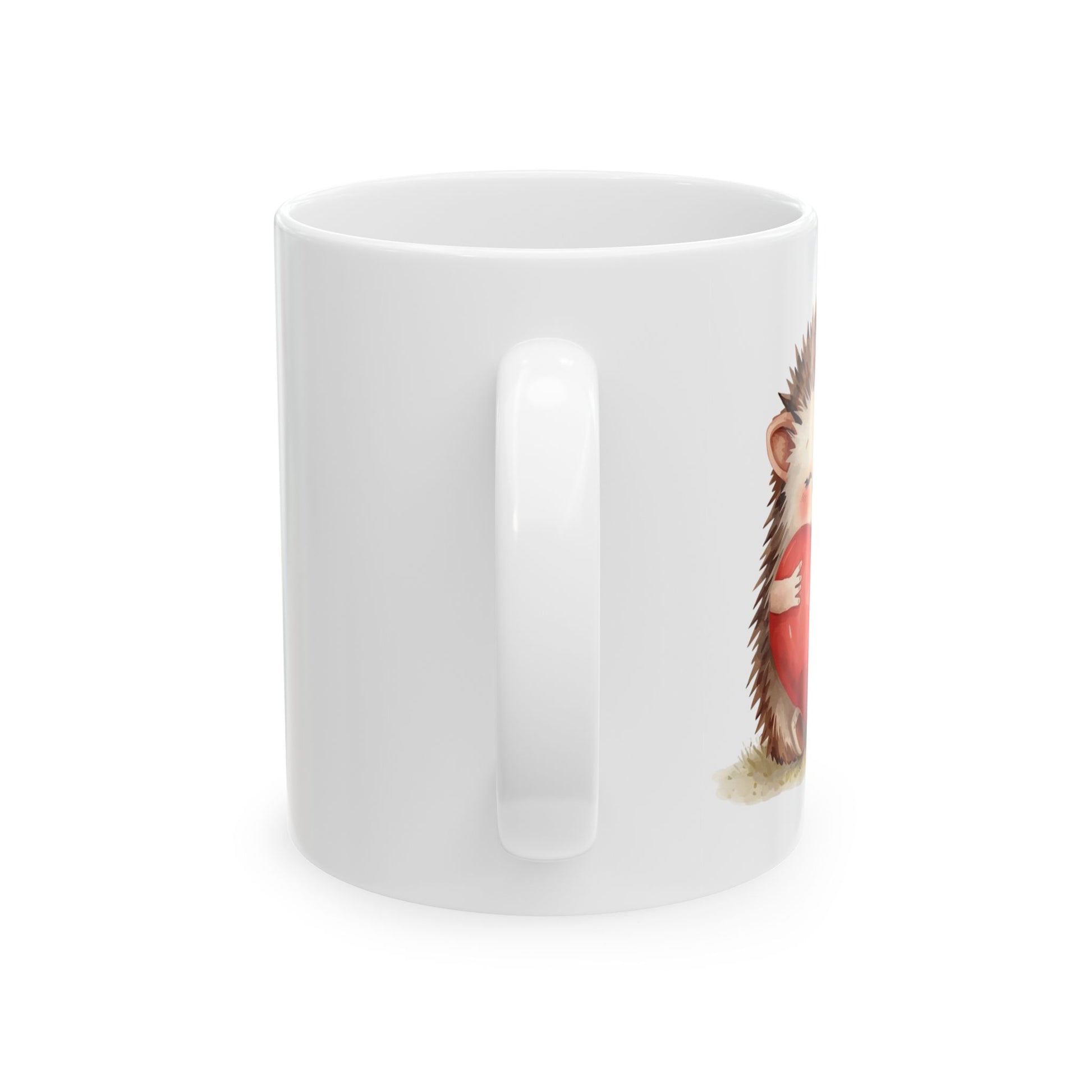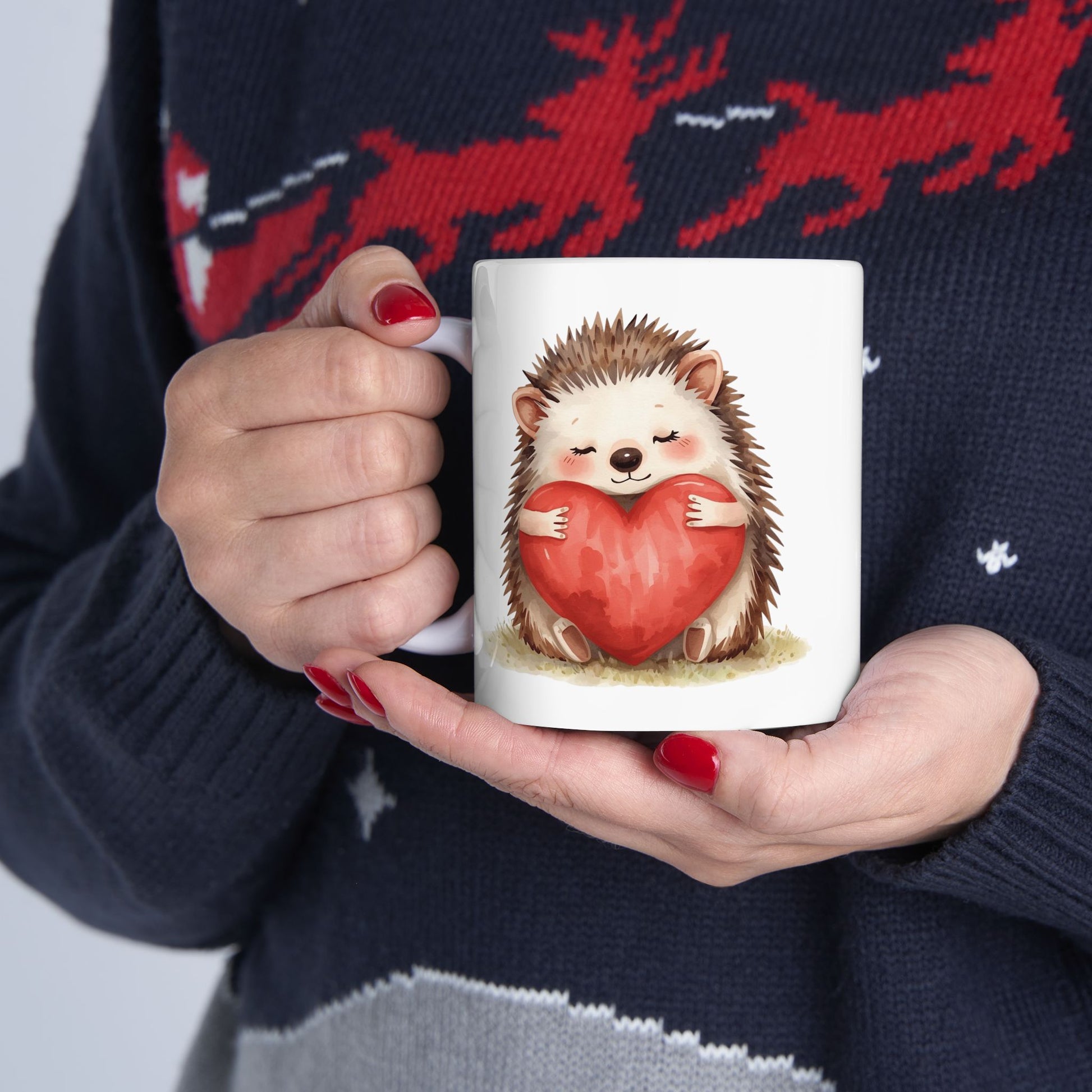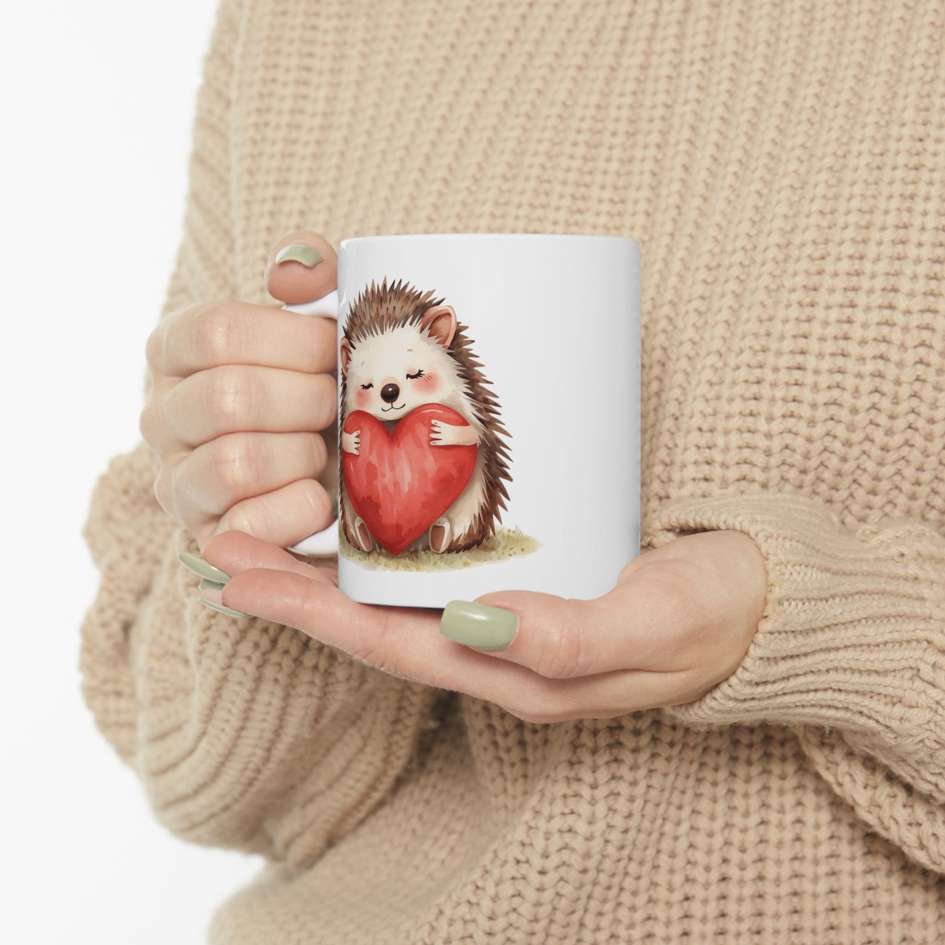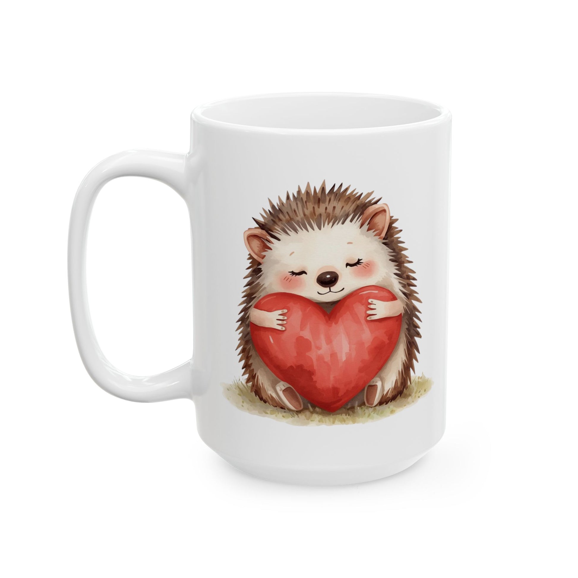 This adorable hedgehog Valentine mug features a sweet hedgehog hugging a bright red heart, radiating warmth and affection. Soft colors and tender details make this design perfect for sharing love in a calm, heartfelt way.