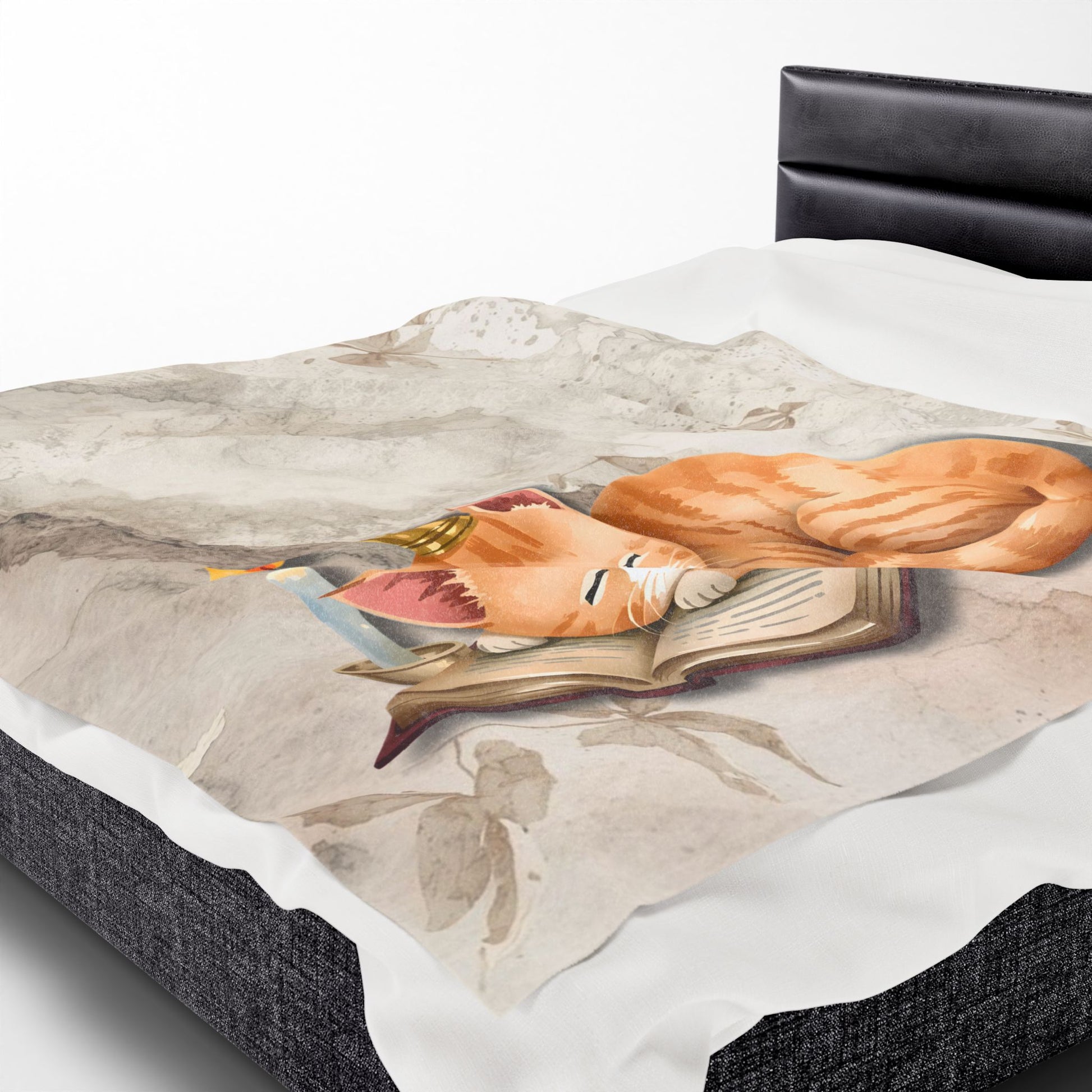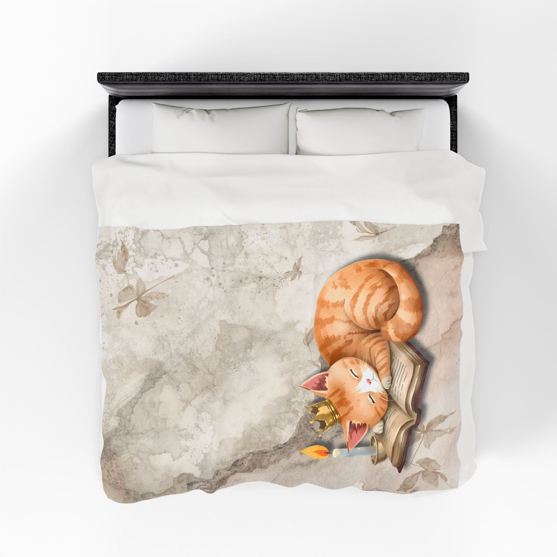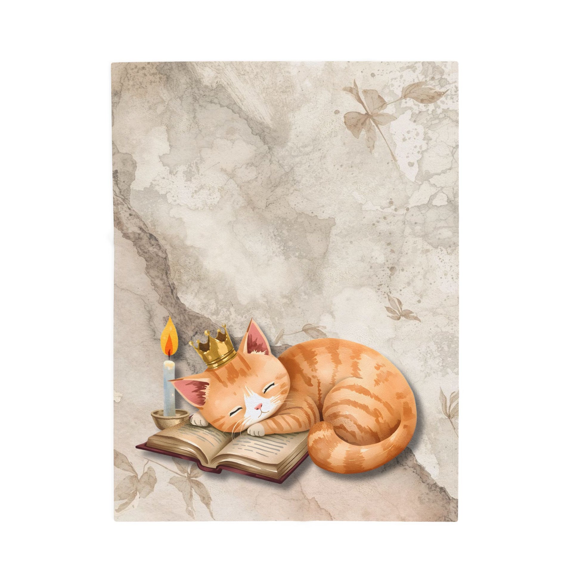 This velveteen plush blanket features a softly illustrated ginger cat resting on a parchment-toned background, a small, restful scene that reads like a whispered pause. The fabric feels plush against skin, with vivid single-sided printing that keeps the artwork bright and detailed. It lands heavy enough to be comforting without weighing you down, and the reinforced double-stitched edges hold up to repeated use. Bring it to reading nooks, chilly couches, or slow Saturday mornings and let it settle into the room like a contented purr.