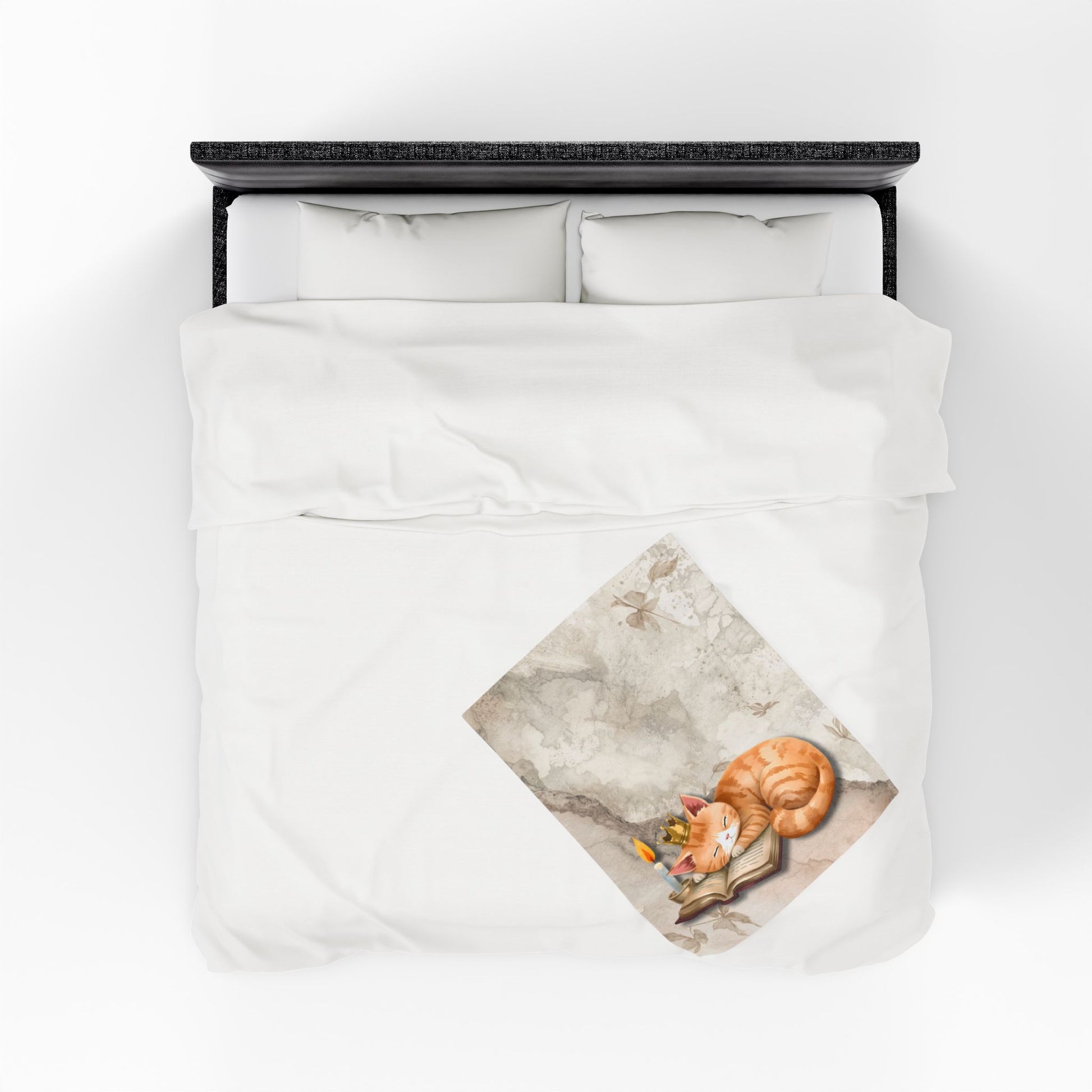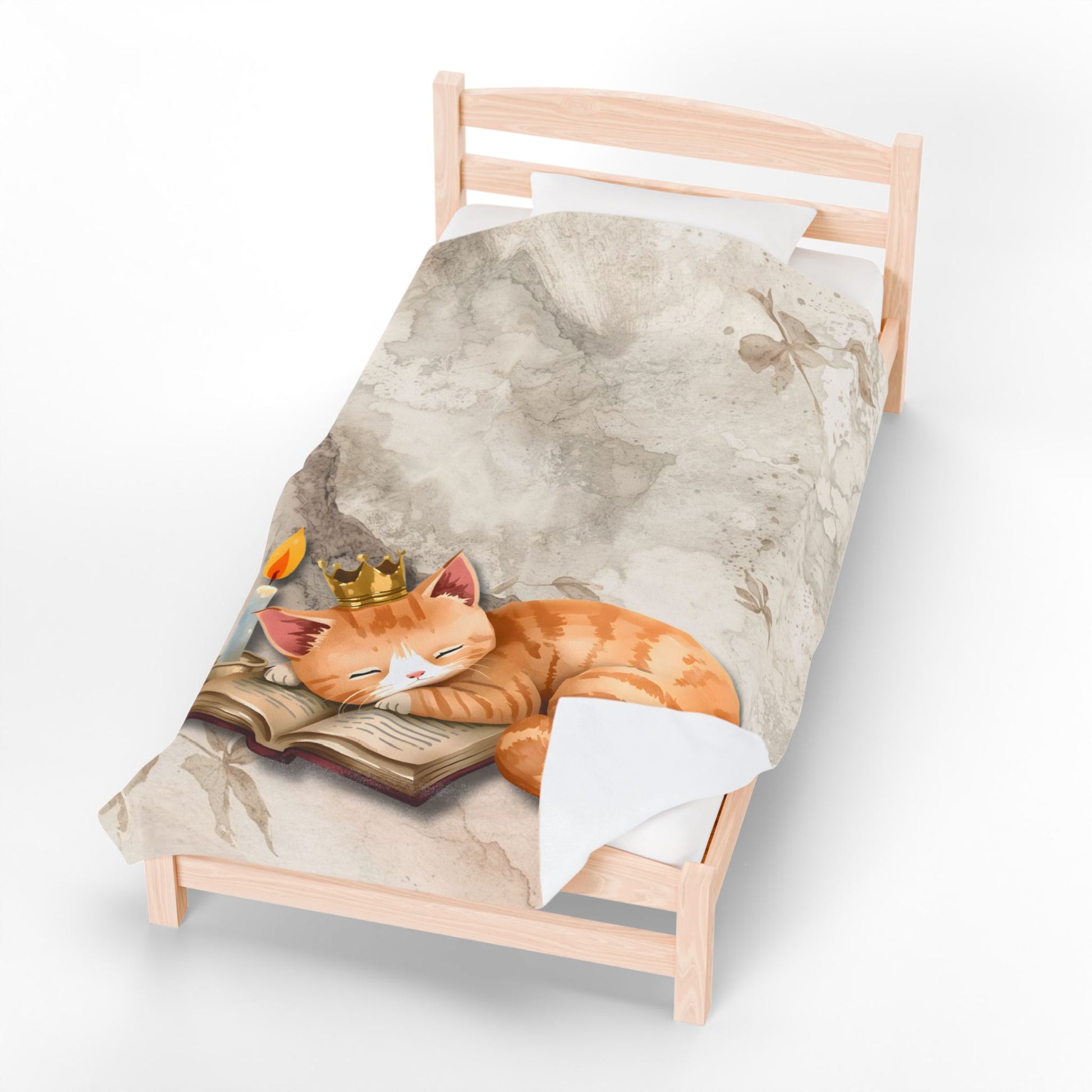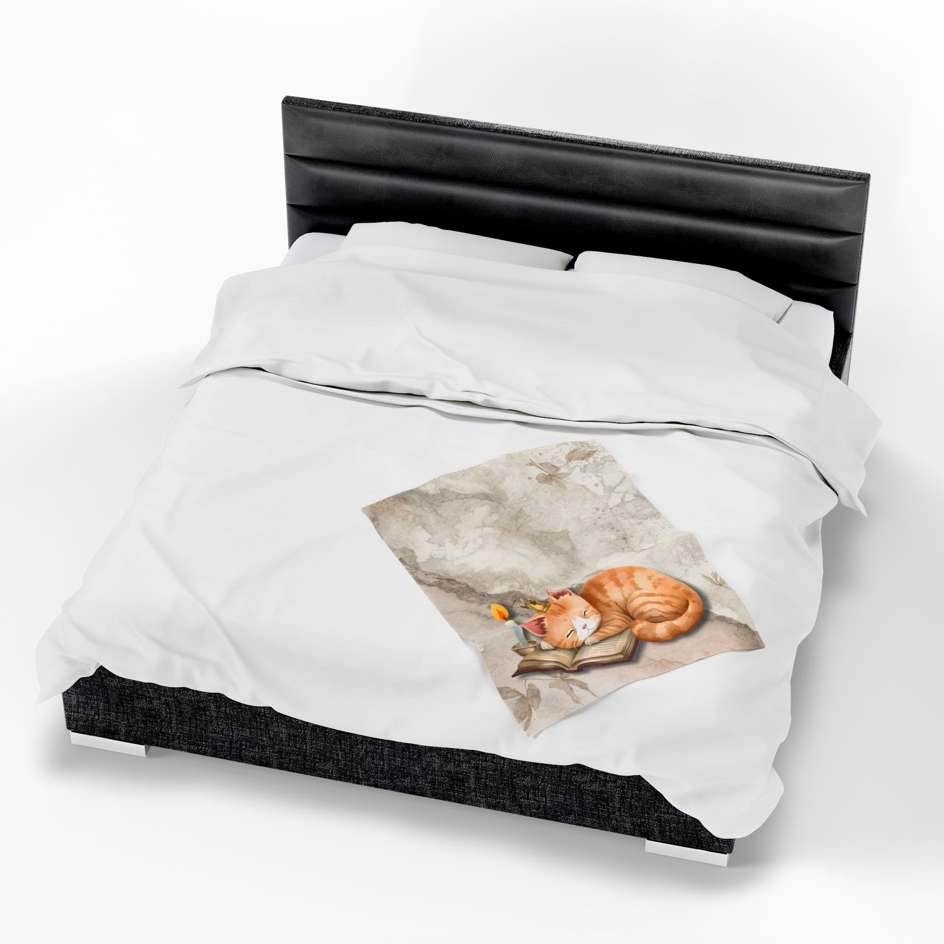 This velveteen plush blanket features a softly illustrated ginger cat resting on a parchment-toned background, a small, restful scene that reads like a whispered pause. The fabric feels plush against skin, with vivid single-sided printing that keeps the artwork bright and detailed. It lands heavy enough to be comforting without weighing you down, and the reinforced double-stitched edges hold up to repeated use. Bring it to reading nooks, chilly couches, or slow Saturday mornings and let it settle into the room like a contented purr.