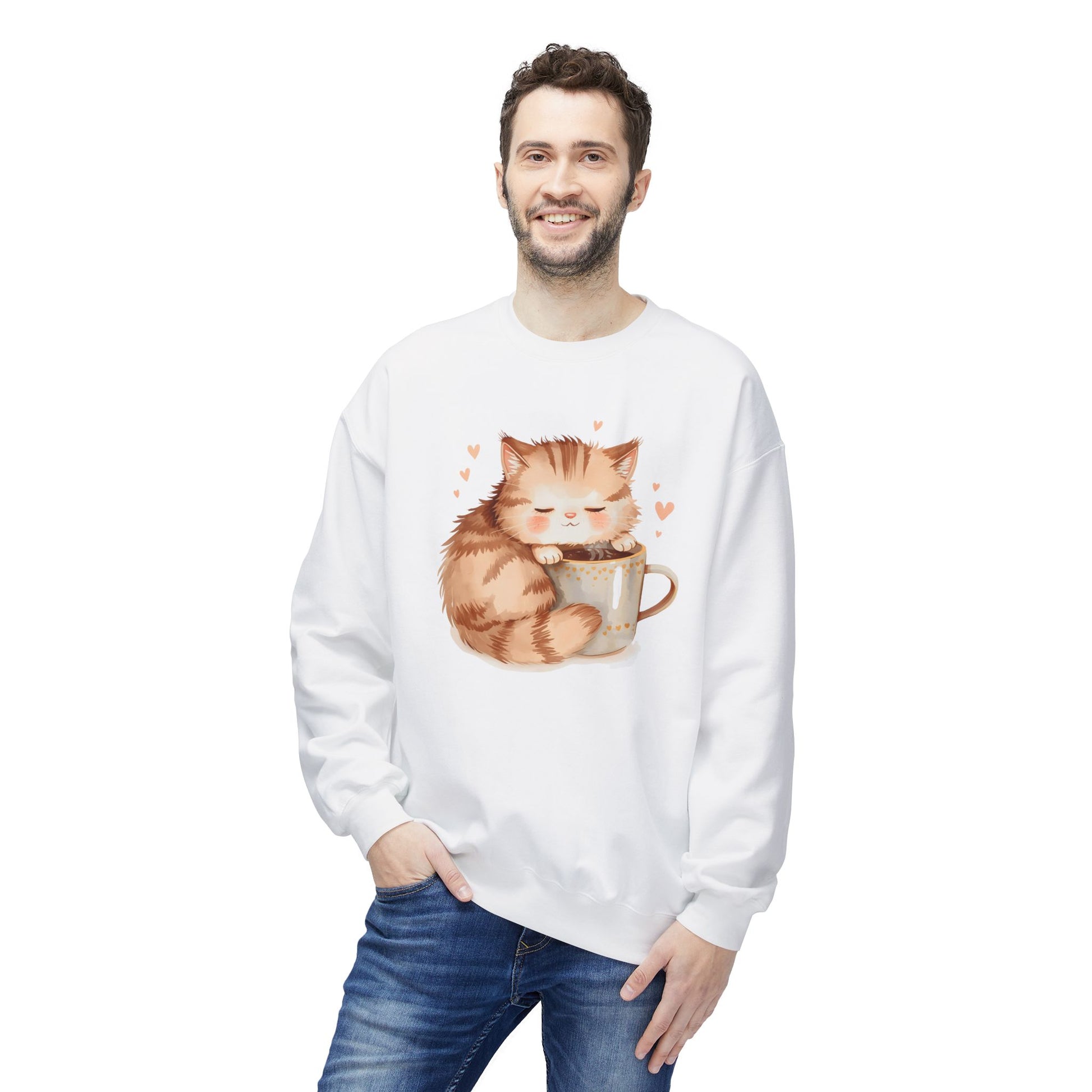 Soft, cozy, and heart-warming. This Sleepy Cat sweatshirt features an adorable kitten cuddled up with a warm drink, creating the ultimate comfort piece for relaxed days and cozy nights. This playful midweight Valentine sweatshirt brings warmth and personality together in one cozy essential. Featuring a wide-format illustration designed specifically for sweatshirts, the artwork sits naturally across the chest for a flattering, high-quality look. The sweatshirt’s plush fabric and relaxed dropped shoulders invite you to curl up with a book or linger over coffee, while the whimsical, hand-drawn pup graphic adds a gentle, playful note. Lightweight enough for layering under a jacket, yet substantial on its own, it moves with you — from neighborhood walks to cozy, at-home movie nights. The tear-away label and smooth tubular knit keep things itch-free and clean, so the only thing you notice is how easy it is to reach for this piece again and again.