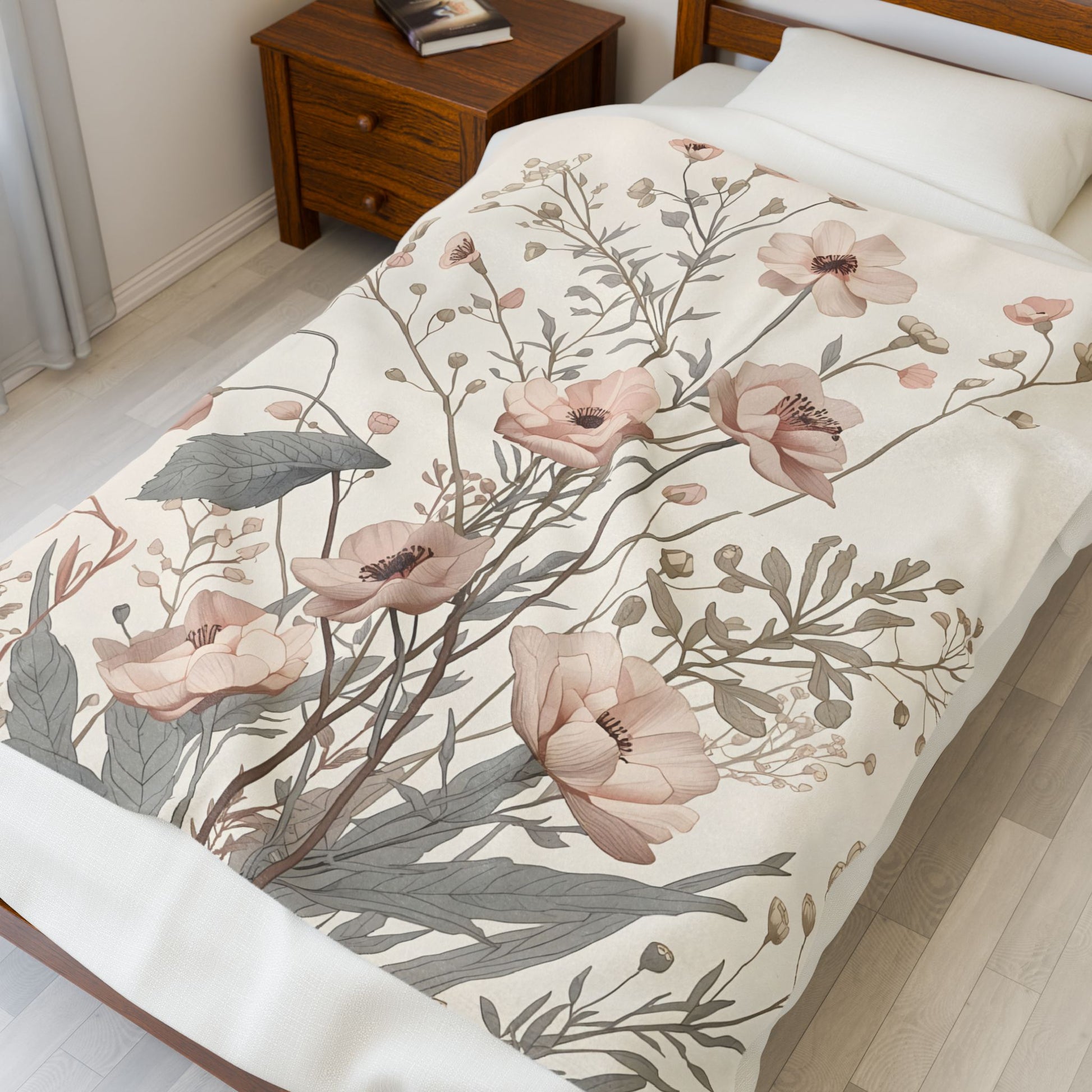 This soft floral throw blanket features a gentle meadow-inspired design with delicate blossoms and flowing stems in muted, neutral tones. Created to bring warmth and calm into your space, it blends beautifully with natural, minimalist, and cozy interiors.
